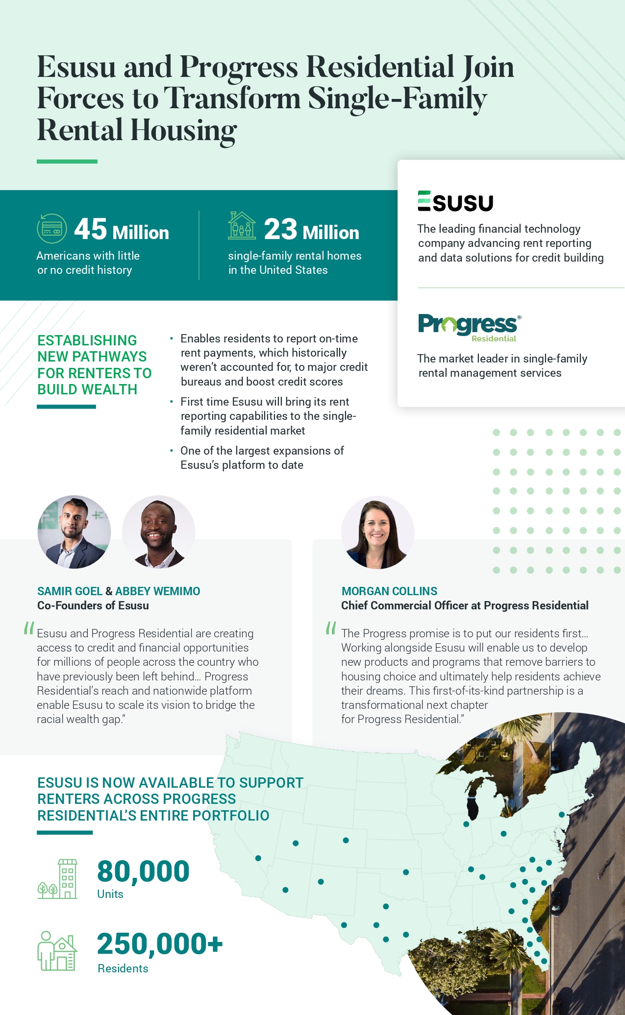 “The Progress promise is to put our residents first, and we are excited to continue doing just that by joining forces with Esusu to extend their credit reporting platform, helping all residents across our single-family rental portfolio build their credit,” said Morgan Collins, Chief Commercial Officer at Progress Residential. “Working alongside Esusu will enable us to develop new products and programs that remove barriers to housing choice and ultimately help residents achieve their dreams. This first-of-its-kind partnership is a transformational next chapter for Progress Residential.”